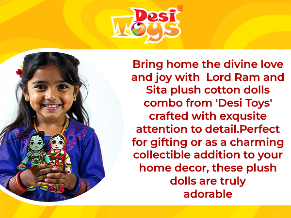 • FEATURE - Bring home the divine love and joy with  Lord Ram and Sita plush cotton dolls combo from 'Desi Toys' crafted with exquisite attention to detail. Perfect for gifting or as a charming collectible addition to your home décor, these plush dolls are truly adorable.