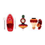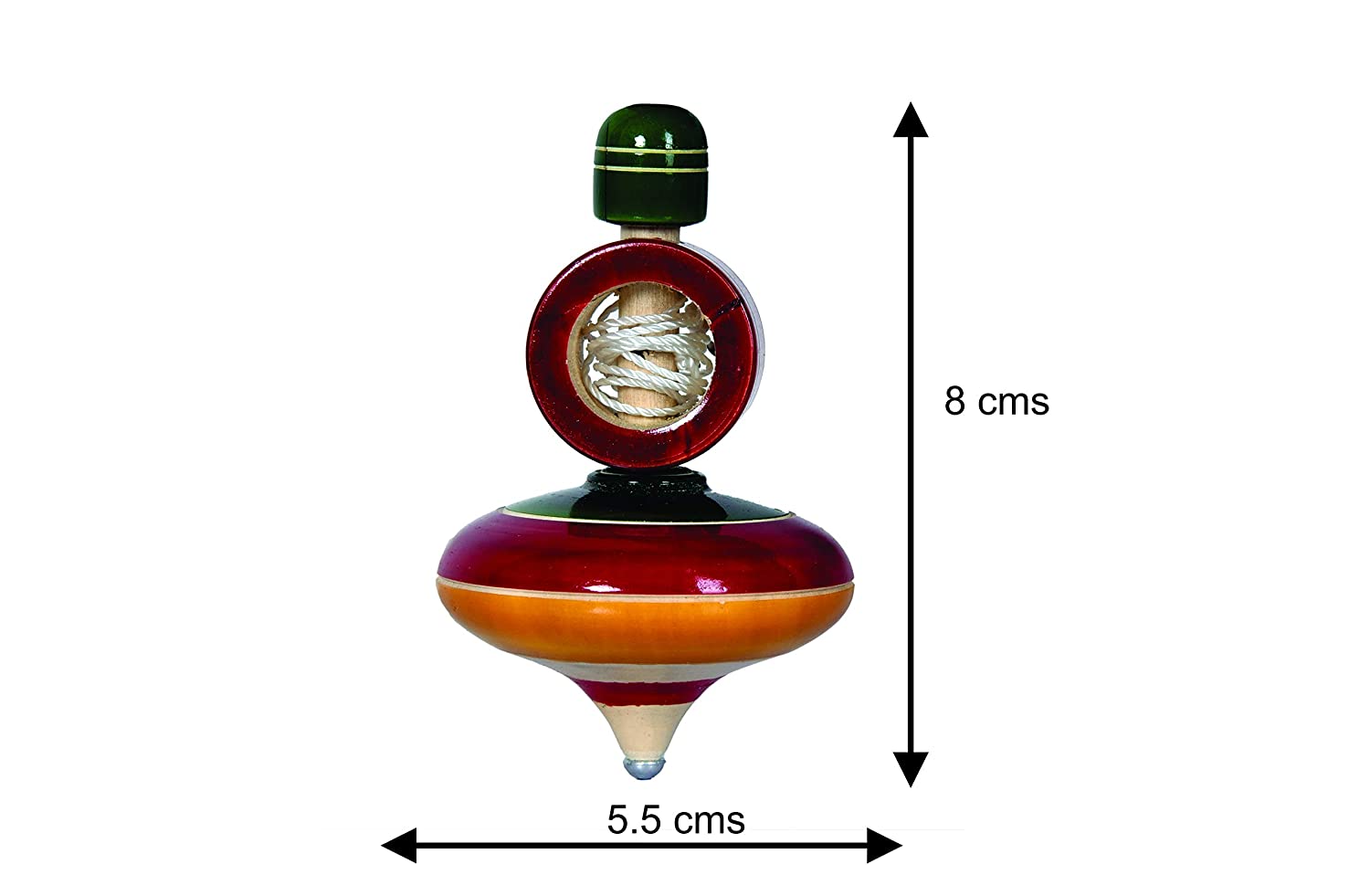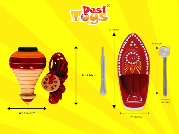 • Dimension & Content - Steam Boat: 1 Tin Toy Boat of 5.5" length, 1 Filler & 1 Candle holder with wax. / Spinning & Windup Tops: 1 Wooden Spinning Top with cord measuring 3" x 1.8" x1.8"and 1 Wooden Windup top measuring 2.4" x2.4"x3"