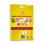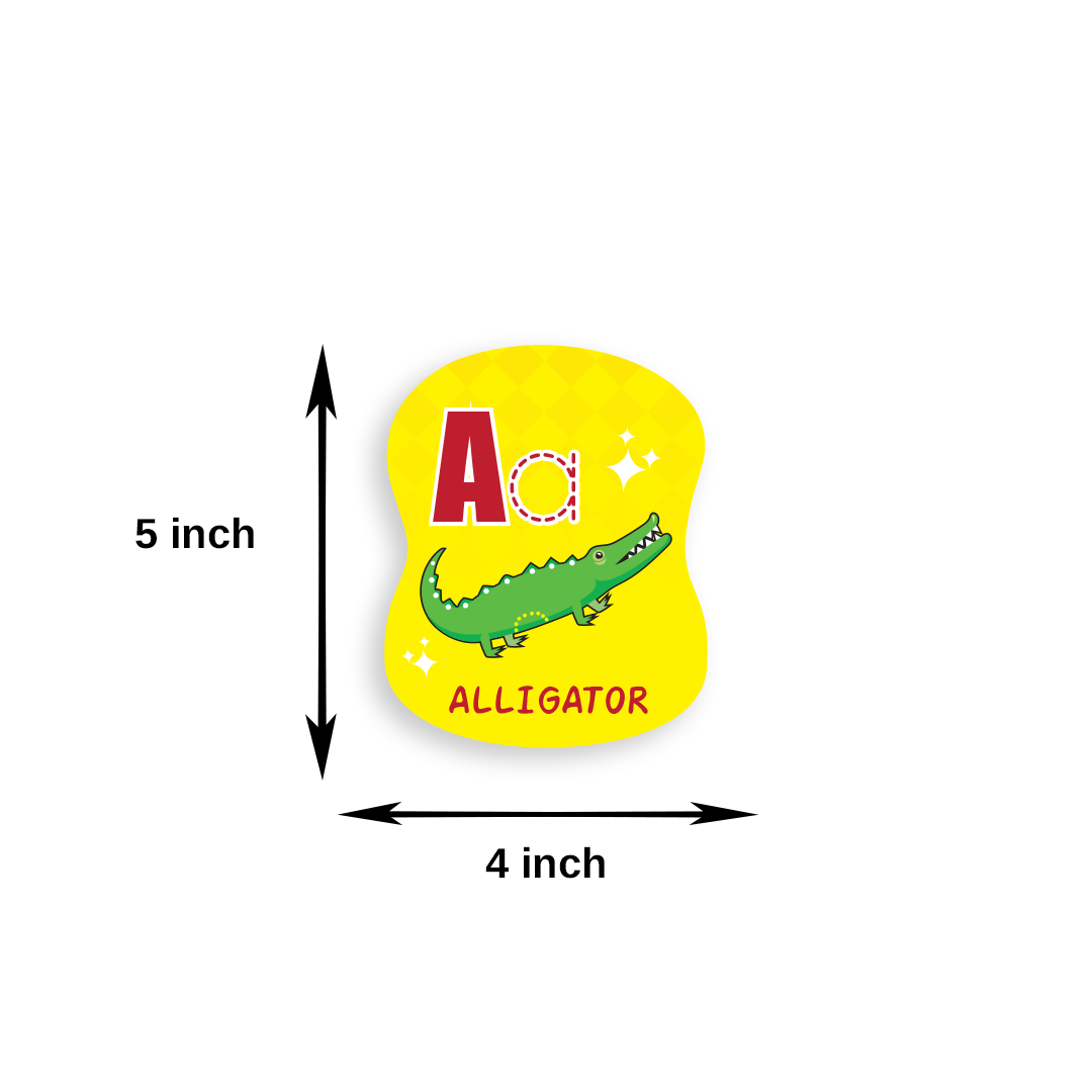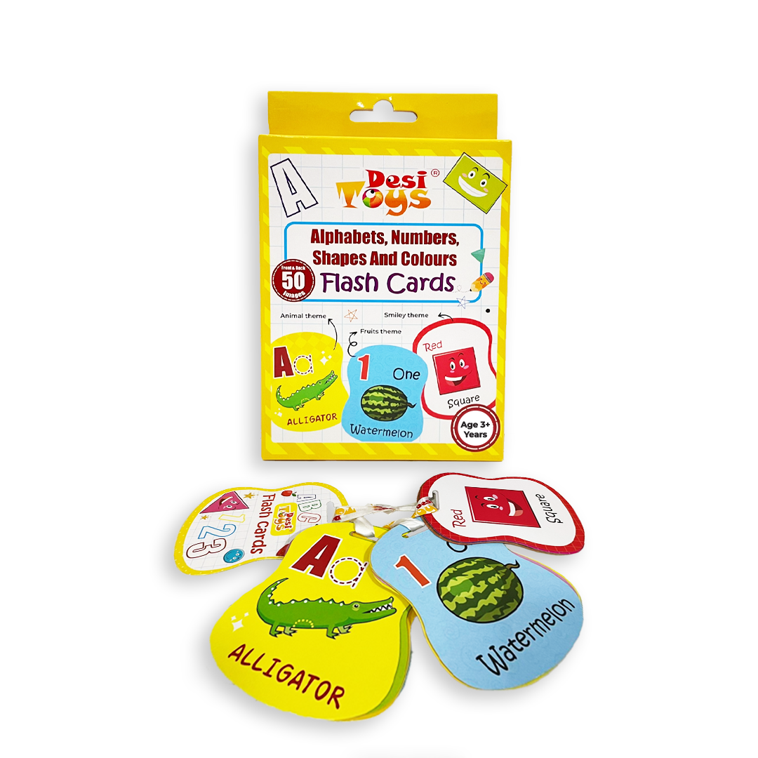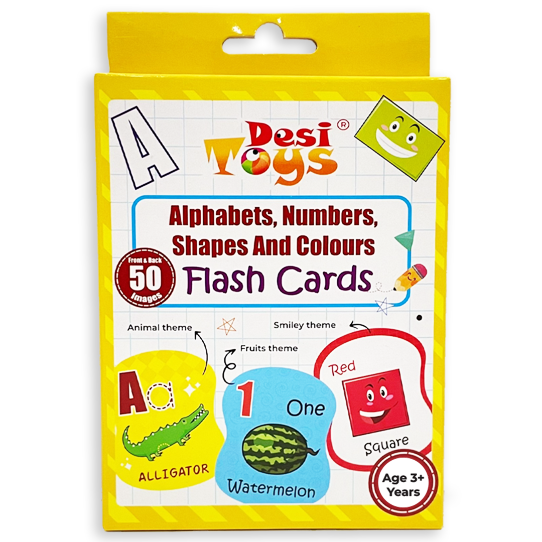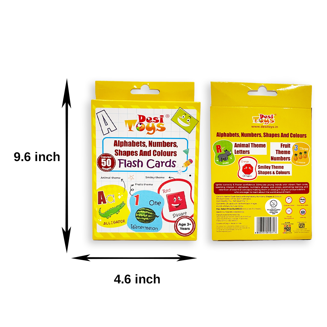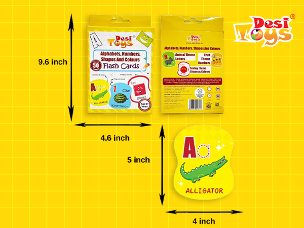 • DIMENSIONS & CONTENT - 25 cards with 50 front and back vibrant visuals. Each card is 5X4 inches and curved on the sides for ease in holding the cards. All Alphabet cards have Animal theme, all Number cards have Fruits theme and all Shape cards have Smiley theme loved by young kids making the cards even more fun.