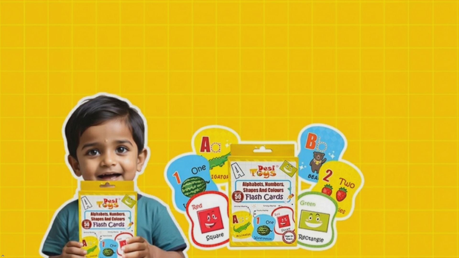 • DIMENSIONS & CONTENT - 25 cards with 50 front and back vibrant visuals. Each card is 5X4 inches and curved on the sides for ease in holding the cards. All Alphabet cards have Animal theme, all Number cards have Fruits theme and all Shape cards have Smiley theme loved by young kids making the cards even more fun.