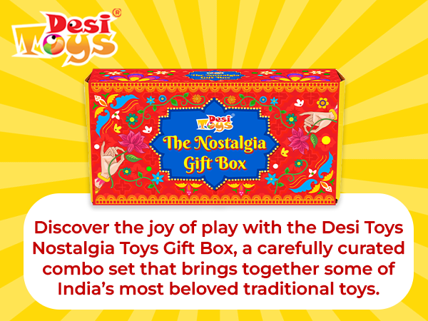 • FEATURES - Crafted with care, each toy in this set is made from eco-friendly, safe, and durable materials, ensuring a worry-free play experience. The Desi Toys Nostalgia Toys Gift Box is not just a gift but a journey back to simpler times, celebrating India’s rich cultural heritage through play.