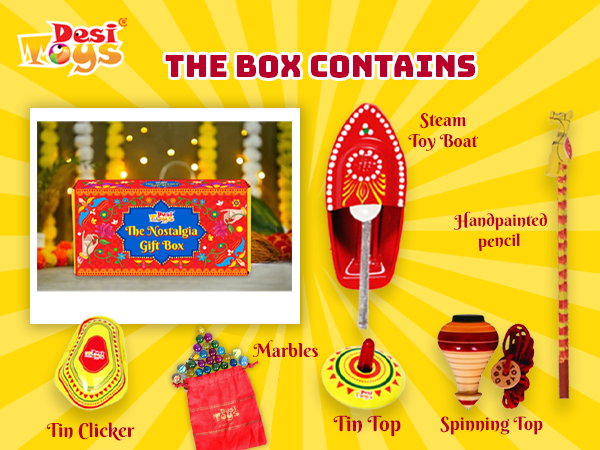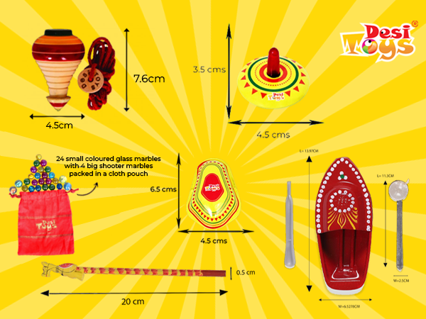 • CONTENT - 1 Wooden Spinning top/Lattu, 1 Steam Toy Boat, 1 Tin Clicker, 1 Tin Spinning top, 1 handcrafted pencil & a Marbles set