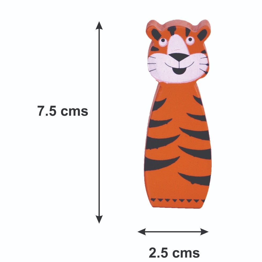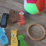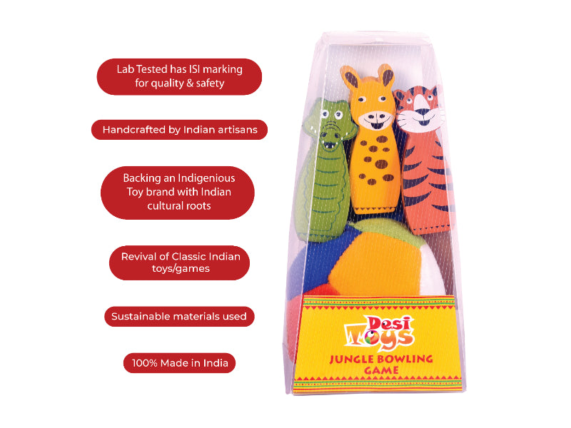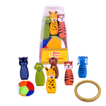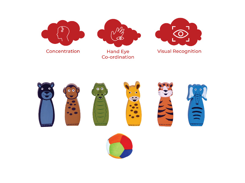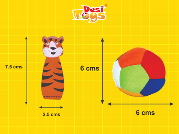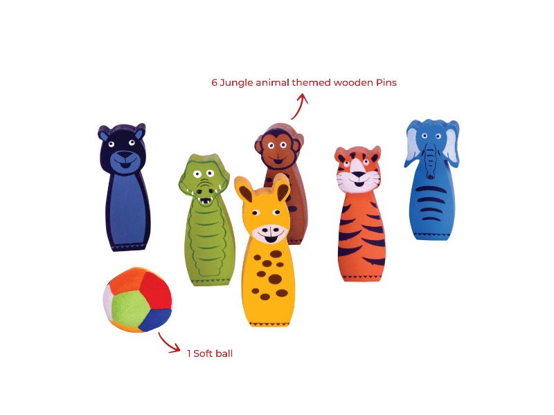 • Dimension & Contents - 6 Jungle animal themed wooden Pins measuring 7.5cms x 2.5cms x 1.5cms with 1 Soft ball