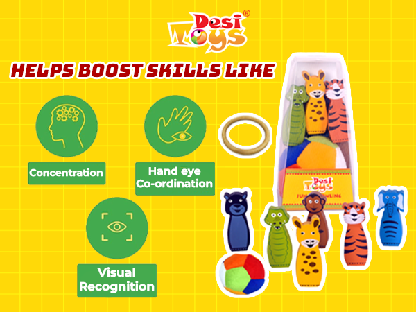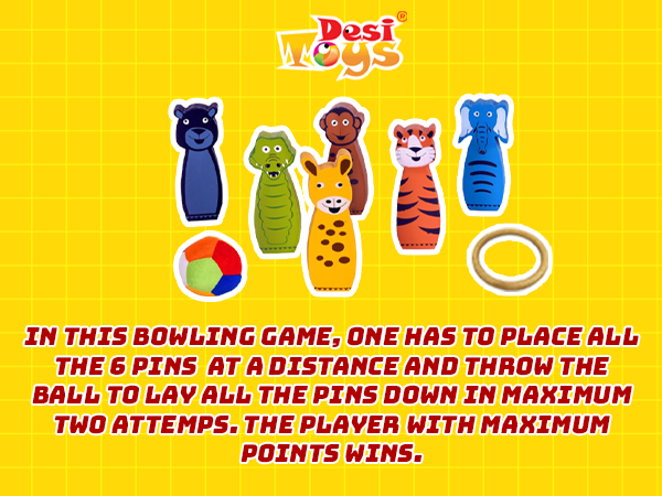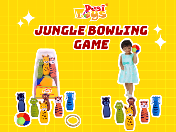 • FEATURE: Bowling becomes more fun & engaging when the animals in the jungle turn up as pins! The wooden pins are brightly coloured with cute  animals that make the game even more exciting for kids! So lets CONCENTRATE & AIM !