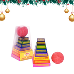 • Dimension & Contents -  7 wooden blocks with decreasing sizes with the largest block measuring 8.5x8.5x1.5 and the smallest block measuring 3.5x3.5x1.5  & 1 Rubber Ball.
