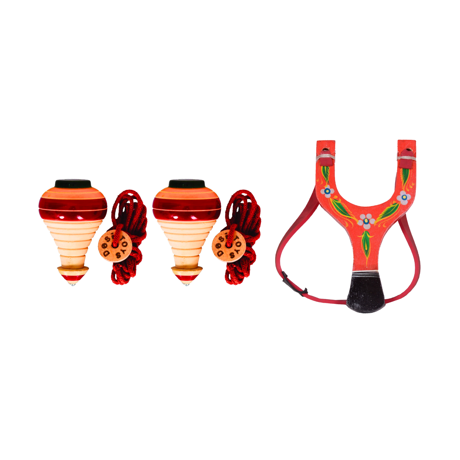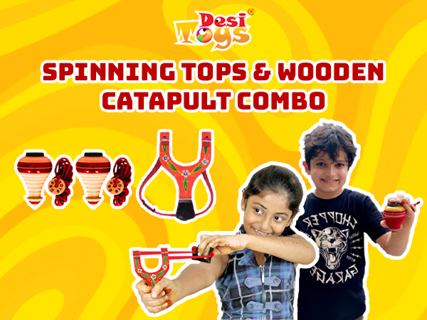 Spinning Tops/Lattu (Pack of 2) & Catapult/Gulel Combo Set | Wooden Toys | Collectible