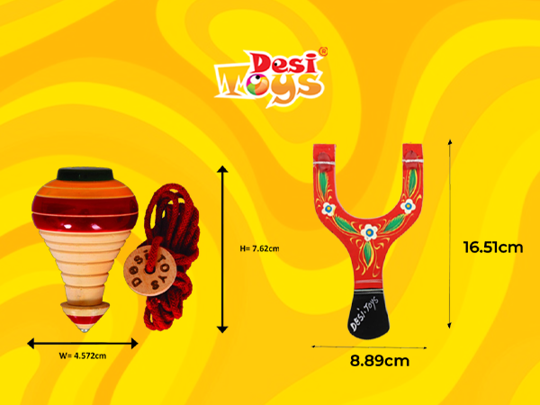 • Dimensions & Content : Spinning Tops/Lattu: 2 Wooden Spinning Tops each measuring 3"x1.8"x1.8" with cords. / Catapult/Gulel: 1 Wooden Catapult measuring 6.5" x3.5" x 0.4" with 3 Foam balls.