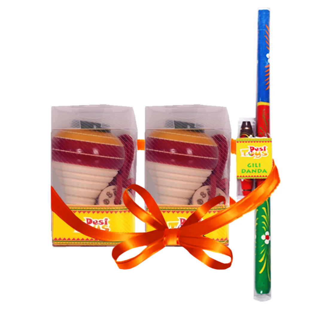 Spinning Tops/Lattu PO2 & Gilli Danda Combo | Viti Dandu & Bhawara Wooden Toys | 8 Years +