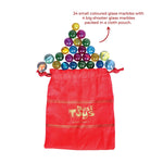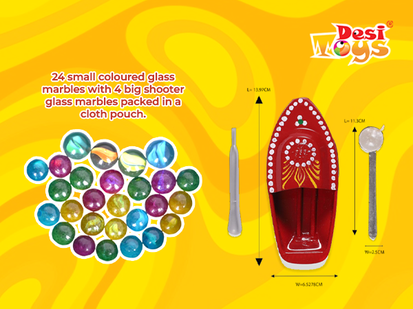 • Dimension & Content - Steam Boat: 1 Tin Toy Boat of 5.5" length, 1 Filler & 1 Candle holder with wax. / Marbles: 24 small colored glass marbles with 4 big shooter glass marbles packed in a cloth pouch.