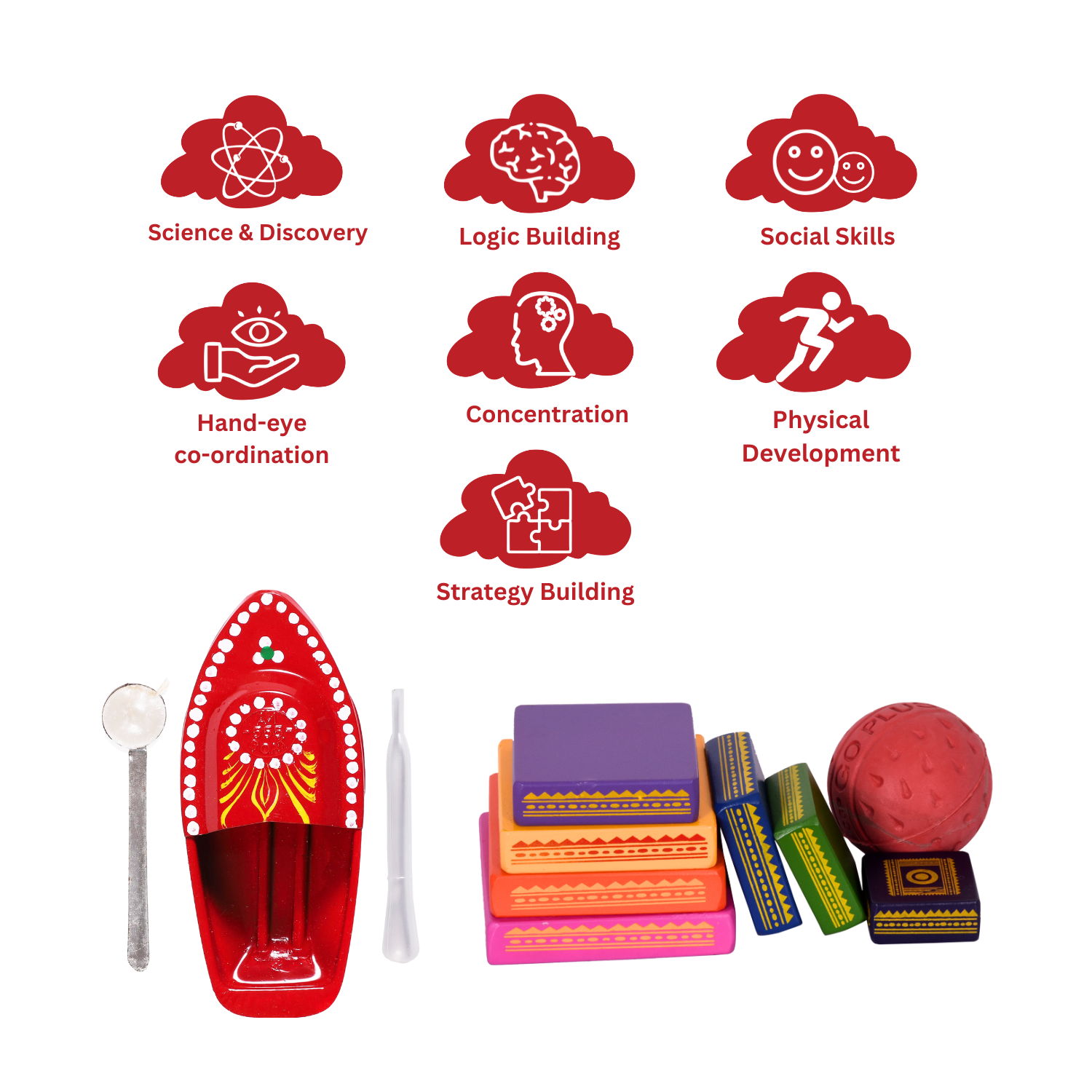 Steam Boat: SKILLS DEVELOPED: Science & Discovery, Logic building /  Seven Stones/Lagori: SKILLS DEVELOPED: Concentration, Physical development, hand eye coordination, Strategy building and Social skills. SUPERIOR QUALITY SAFETY: BIS Lab tested with ISI marking