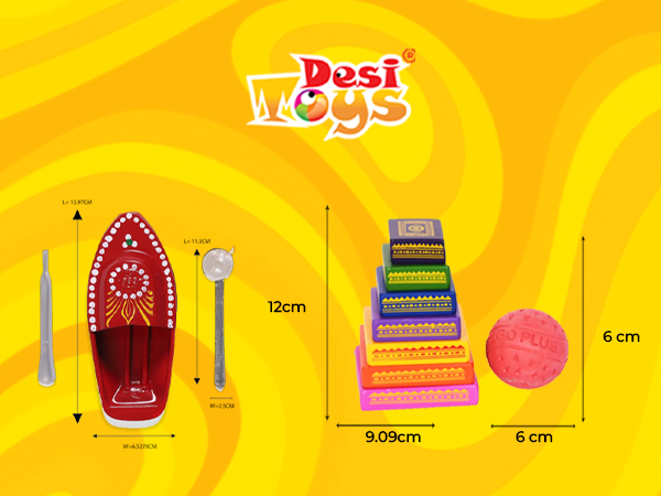 • Dimension & Content - Steam Boat: 1 Tin Toy Boat of 5.5" length, 1 Filler & 1 Candle holder with wax. / Seven Stones/Lagori: 7 wooden blocks with decreasing sizes with the largest block measuring 8.5x8.5x1.5 and the smallest block measuring 3.5x3.5x1.5  & 1 Rubber Ball