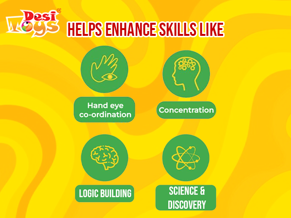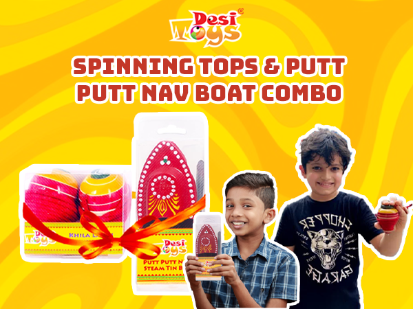 Steam Boat: SKILLS DEVELOPED: Science & Discovery, Logic building / Spinning Tops/Lattu: SKILLS DEVELOPED: Science & discovery, Hand eye coordination, Concentration & Logic building.