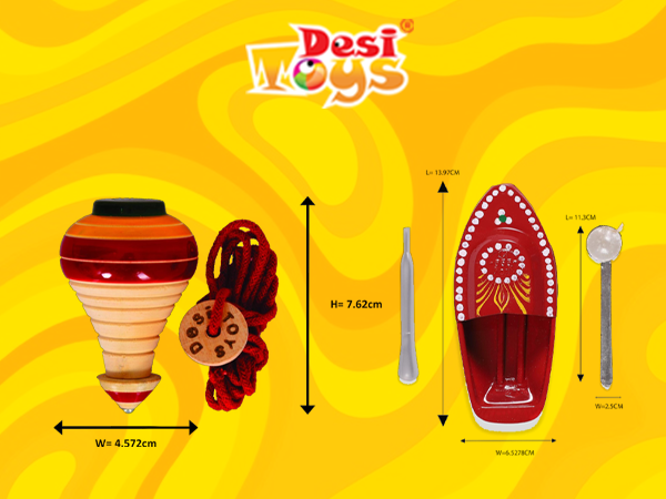 • Dimension & Content - Steam Boat: 1 Tin Toy Boat of 5.5" length, 1 Filler & 1 Candle holder with wax. / Spinning Tops/Lattu: 2 Wooden Spinning Tops each measuring 3"x1.8"x1.8" with cords