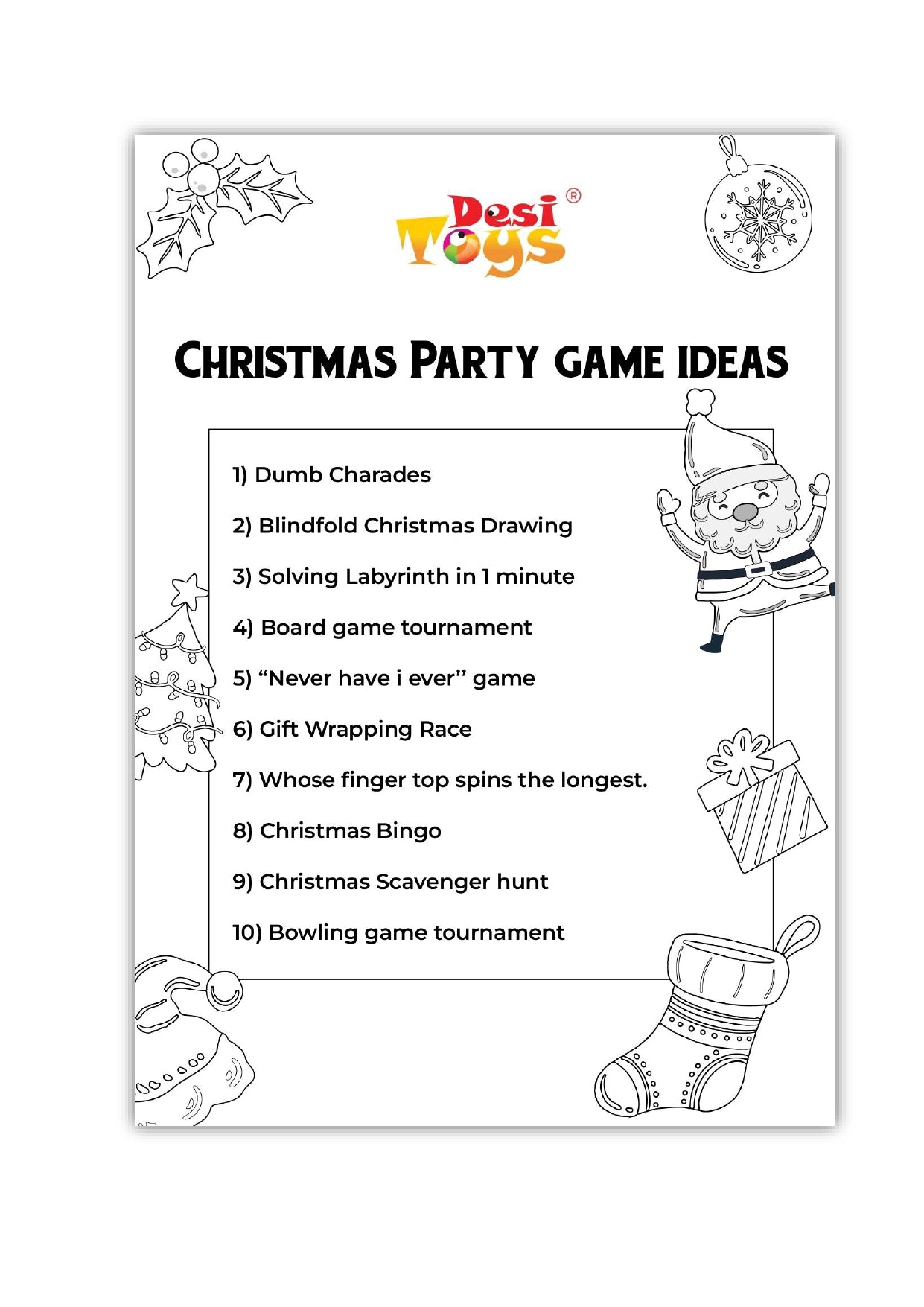Bring festive fun to your celebrations with our Christmas Party Game Ideas – Activity Sheet! This joyful and engaging printable is thoughtfully designed to add excitement, creativity, and laughter to your Christmas parties. Packed with fun activities and interactive games, it encourages kids (and even adults!) to think, play, and celebrate the holiday spirit together.